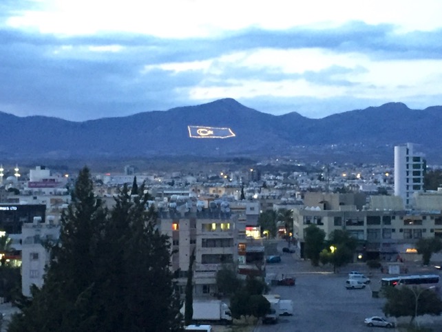 Meanwhile, the markers of partition and competing claims for statehood are deeply inscribed into the mental maps of Cypriots, as well as into the topography and geography of the island. Our study group was based in a hotel in the northern part of the city. From the upper floors of the building we could see the humungous maps of Turkey and the TRNC, carved deeply into the Pentadactylos mountain range and illuminated at dark.