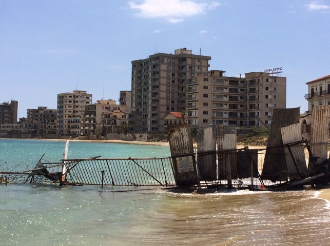 Nowhere is this interpenetration of the routine and the absurd, the mundane and the anomalous more visible than in Varosha, the Turkish-occupied ghost town, which was once the tourist sector of Famagusta and one of the fanciest Mediterranean resorts of the 1960s. Inaccessible and slowly crumbling away under the watchful eye of the Turkish army, Varosha’s abandoned hotels are in full view of the sunbathers, who occupy a small stretch called Palm Beach.