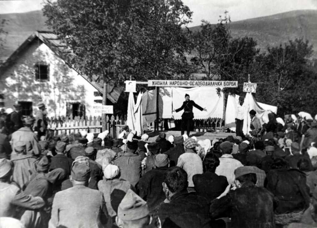 Božović does not mention what group of artists performed on the described day. Notably, there were many such groups in Yugoslavia during the war. The first such groups formed both in military units and among civilian supporters, gathered to mark locally relevant occasions. According to Maja Hribar-Ožegović’s foundational research, the people who came together in those ad hoc groups as a rule had little professional experience. However, despite this shortcoming, they attracted large numbers of viewers and managed to interest and mobilize many of them for the goals of the People’s Liberation Struggle (1965, 14). Already during 1942, leadership expectations were formalized through various regulations and based on them (with greater or lesser success) were implemented throughout Yugoslav countries. The most famous and successful in this respect were the Theater of the People’s Liberation (Kazalište narodnog oslobođenja, KNO) and the Slovenian People’s Theater (Slovensko narodno gledališče, SNG), two groups that the theatrologist Aldo Milohnić describes as “two gusts of the merry wind of the Partisan theater.” (2015, 57)